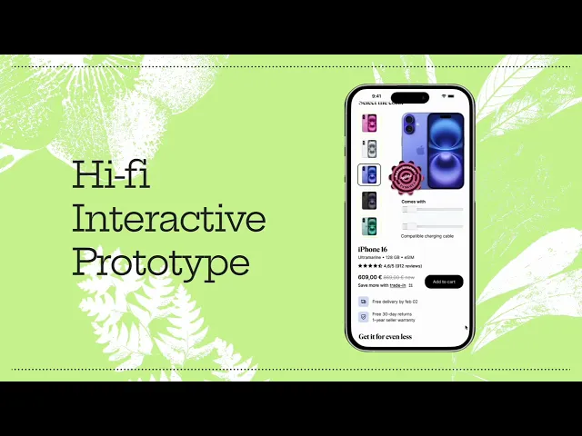 I iterated from low to high fidelity prototypes, mobile-first and responsive. Low-fi tests with 6 users validated the Prove → Price → Trust → Buy pattern and above-the-fold warranty placement. Mid-fi prototypes introduced micro-interactions such as a trade-in overlay and refurb video auto-play. High-fi tests with 8 users surfaced two fixes: animations were too fast and some colors felt inconsistent; I slowed motion and tightened the palette.