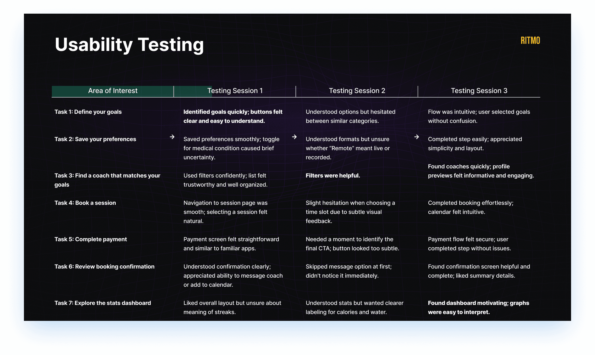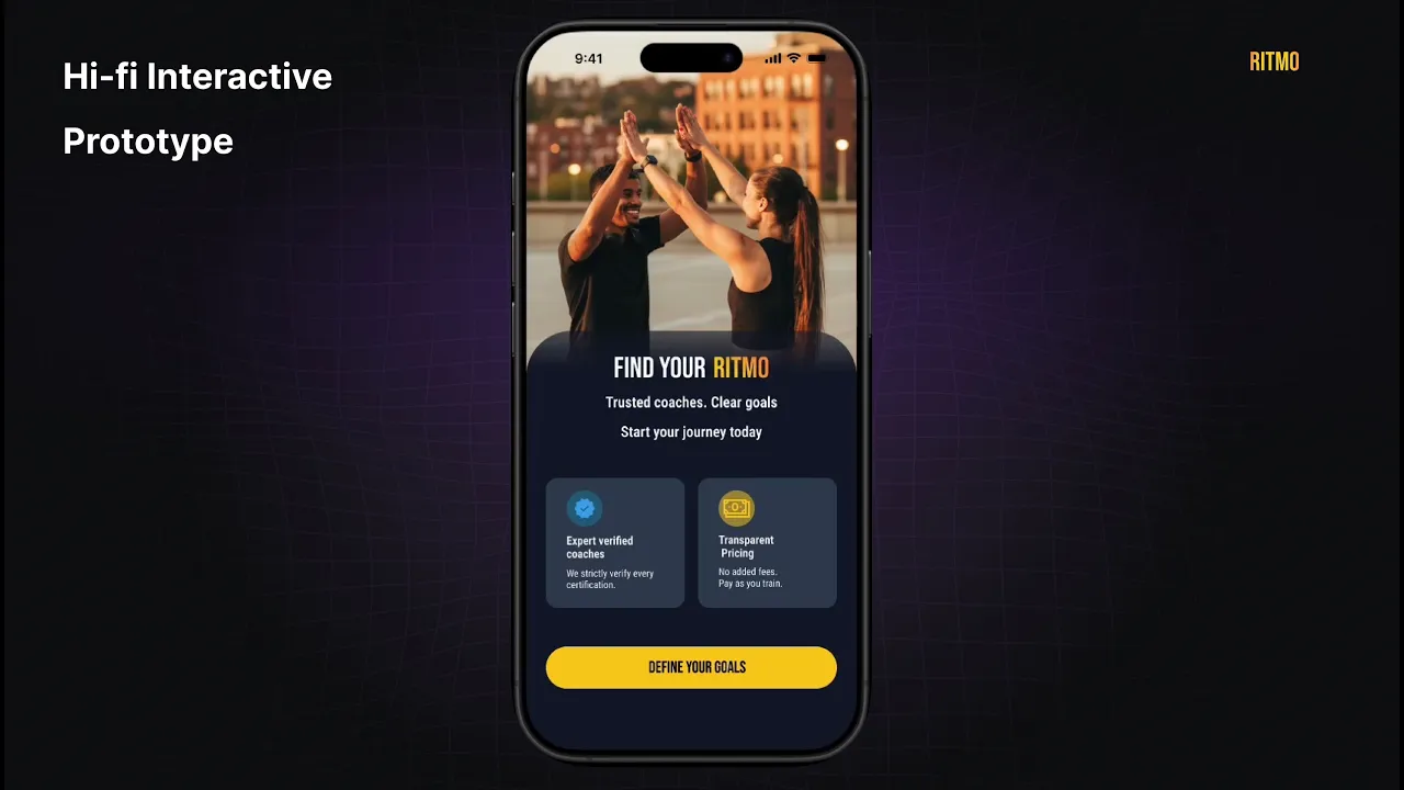 Ritmo is a mobile-first coaching platform designed around safety and trust. Users declare goals and medical constraints upfront, filter coaches by verified certifications, and compare profiles with transparent credentials, reviews, and pricing. Matching prioritizes qualification over quantity, and booking is seamless with payment confirmed after session completion. The result is a clear, safe path from need to coach.
